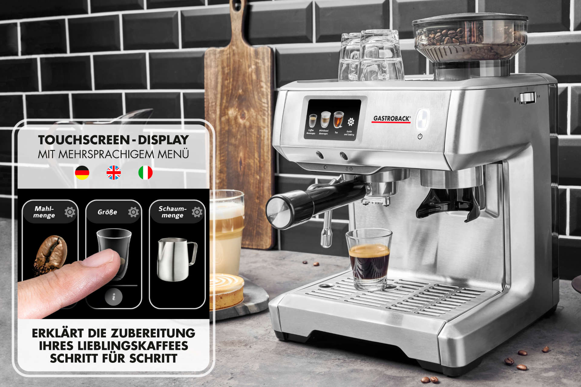 Die programmierbare Siebträger-Espressomaschine DESIGN ESPRESSO BARISTA TOUCH von GASTROBACK® ist die ideale Espressomaschine für Kaffeegetränke in Barista-Qualität und das ganz einfach per Fingerdruck. Denn die Bedienung erfolgt ganz einfach über einen intuitiven LCD-Touchscreen. Alle Zubereitungsschritte der Kaffee- und Teespezialitäten werden leicht und verständlich Schritt für Schritt in einem mehrsprachigen Menü erklärt.